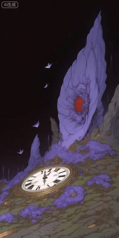 a whimsical digital illustration shoot from a far camera angle about a surreal landscape featuring a large, purple flower-like structure on a rocky hillside with a small, ornate clock in the foreground, the scene is set against a dark, starry night sky, with a few small butterflies fluttering around, on the right side of the image, a large purple flower with a red center sits atop a rocky outcrop, adding a sense of depth and dimension to the image, the flower is surrounded by small, purple flowers, and the clock has roman numerals and a white face with black hands, the overall atmosphere is surreal and dreamlike, with the flower and clock standing out against the dark background,