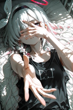 1girl,plana \(blue archive\),(aogisa:0.52),(as109:0.82),(dagasi:0.56),(yoneyama mai:1.12),(dino \(dinoartforame\):0.9),(quasarcake:0.72),(naga u:0.69),limited palette,masterpiece,best quality,amazing quality,very aesthetic,long hair,alternate costume,**** top,(from above),arm up,reaching,reaching towards viewer,outstretched arm,outstretched hand,fingers,depth of field,(foreshortening, hand over face:1.2),dappled sunlight,perspective,lying,on back,hand focus,upper body,chromatic aberration,