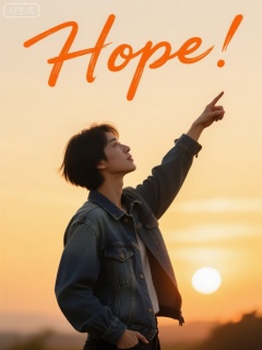 mlxqx,画面背景是金黄落日,下方有一位穿着牛仔外套、留着短发的男生,单手插兜,另一只手举起指向天空,似在满怀憧憬眺望。上方有橙色手写风格的“Hope!” 文字,整体给人满怀希望、追逐憧憬的感觉。