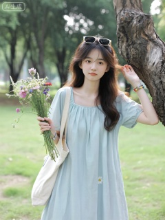 RXXZ,一位年轻女孩身着一件淡蓝色的宽松棉质连衣裙在户外。裙子有着简约的方领设计,左侧裙摆处绣着一朵精致的小雏菊。她的棕色长发自然垂落,发尾微微卷曲,戴着一副细金属框的白色墨镜,镜腿优雅地架在鼻梁上。她的右手拿着一束刚采摘的野花,花朵颜色多样,有粉的、紫的、黄的,左手轻轻扶着身旁一棵粗壮的老树树干,手上还戴着一串由彩色珠子串成的手链。她的右手腕上戴着一块小巧的银色手表,左肩上斜挎着一个米白色的帆布包,包带自然垂落。背景是一片绿意盎然的草地,远处有几棵高大的树木,阳光透过树叶的缝隙洒下,形成一片片光斑,营造出一种宁静而美好的氛围。