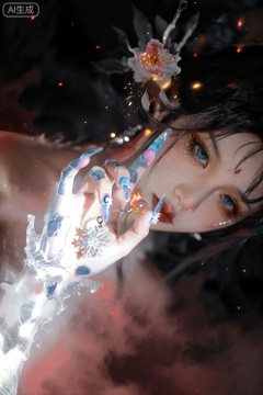 梦幻奇幻的场景,最终幻想风格,斜向俯视,滚滚缭绕微微泛红的黑色迷雾背景,一只女性手从画面迷雾中心点伸出,哥特风格装饰,透白色基底上用裂纹胶制造冰裂效果,叠加银色细闪,冰晶裂纹美甲,极地冰川的清冷高级感,甲面随机粘贴六角形冰晶,食指用蓝色偏光粉晕染,无名指镶嵌一颗微型雪花吊坠,冰晶裂纹美甲,手指尖捏着一片顶部燃烧的花瓣,blurry,抽帧,迷离,整体氛围唯美又暗黑风浓郁,偏向极简主义一个灵动纯美的《八重樱》女生模糊人像及场景,暗朦,半身特写,真人cosplay,周围有泛火星点点,突出动态发丝的凌乱美,超高颜值,手对着画面,掌心有颗糖果,极致高清晰度,极致细节,一个由粒子组成的牡丹花妖星河灿烂的眼眸,从眉眼间飘过行云流水和万千星展,粒子发光生物发光金色闪片透明流体,面部特写,玄幻缥缈的,脸部特写,杰出的,大师杰作品,国风,岩彩板画,古风意境,暖色系,迷幻,弥散渐变,层次感,dreamlike,超现实主义美学,空灵,如梦似幻,极致写实油画,绝美光影,三维古风,微距摄影,移轴拍摄,高角度拍摄,浪漫古风,电影光,生物学发光,唯美美人鱼背景,大唐盛世氛围,华丽惊艳氛围带浪漫感,高贵优雅,机械毒液绿色调曲线美,复古,迷离,伦勃朗光,低饱和,反射,折射,肌理质感,高噪点,胶片颗粒质感,极简风,柔焦灰度美学,情绪写意,前卫视觉艺术美学,大片高级感,电影美学,大师杰作