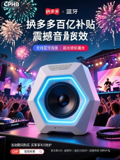 CPHB,该图像是蓝牙音箱产品的广告。这款蓝牙音箱以独特的几何形状呈现,外壳采用白色磨砂材质,搭配蓝色的LED灯带,在开启时灯光闪烁,营造出科技感与艺术感兼具的氛围。音箱内部有着高品质的扬声器单元,能够释放出清晰、饱满且富有层次感的声音,暗示着“震撼音效”与“时尚外观”的特点。背景以充满活力的音乐节现场为特色,其中有热情的观众、绚丽的舞台灯光,与动感的DJ和激情四溢的乐队表演相互呼应。天空中绽放着五彩斑斓的烟花,整个场景充满了欢快和热烈的气氛。图像中的文字包括用于拼多多百亿补贴的促销信息,突出显示了诸如“无线蓝牙连接”“超长续航播放”之类的功能,以及活动期间购买享有的特殊优惠,其中包括音箱保护套和音频线。总体设计结合了现代音乐潮流美学的元素以及科技产品的时尚呈现。