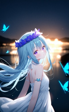 masterpiece,absurdres,best quality,high quality,chromatic_aberration,night,darkness,black theme,photorealistic,high contrast,high saturatio,//,deyui,rucaco,chen_bin,tinker_ bell,eip (pepai),torino aqua,rhasta,wlop,ke-ta,//,1girl,solo,long hair,looking at viewer,bangs,simple background,hat,white background,dress,hair between eyes,jewelry,blue hair,purple eyes,upper body,parted lips,from side,bug,butterfly,armlet,chromatic aberration,arm strap,blue butterfly,//,official art,depth of field,detailed light,blurry background,cinematic lighting,ray tracing,ultra detailed,god rays,backlighting,photo background,film grain,chromatic aberration,volumetric lighting,depth of field,blurry background,shiny skin,floating hair,cinematic lighting,day,very aesthetic,cowboy shot,look up,head wreath,