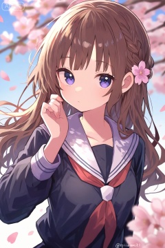 1girl,solo,school uniform,flower,long hair,red neckerchief,neckerchief,cherry blossoms,serafuku,hair ornament,hair flower,sailor collar,braid,upper body,looking at viewer,white sailor collar,branch,long sleeves,shirt,blue eyes,petals,bangs,outdoors,closed mouth,blurry,brown hair,hand up,pink flower,day,twitter username,purple eyes,black shirt,blushed,