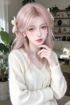 1girl, fresh Japanese half-body photo, light pink shoulder-length short hair slightly curly, wearing pearl hairpins. A milky white knitted hollow sweater with a slightly open collarbone that reveals the delicate collarbone and thin silver necklace. Hold your chin with your right hand and gently pull the corner of your sweater with your left hand. Your cheeks are slightly red, your eyes are lively and innocent. The background is full of sunshine log bookshelf and green plants to create a gentle and sweet atmosphere.,Ninger