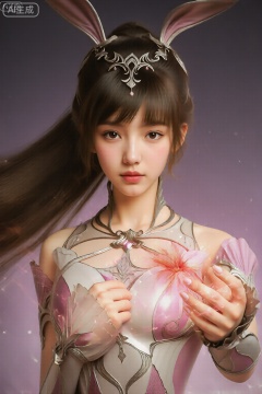 图像描绘了一位年轻女子,拥有长长的、飘逸的棕色头发,戴着设计复杂的银色头饰和两只大的粉红色兔子耳朵。她的眼睛很大,表情丰富,目光柔和。她穿着一套精致的、充满奇幻风格的服装,包括金属、银色和粉色的紧身胸衣,上面有花卉图案和精致的扇形结构。紧身胸衣上饰有粉色和红色的花朵图案,她的双手周围有闪闪发光的颗粒,双手在胸前轻轻地握在一起。背景是柔和的紫色和粉色渐变,带有细小的漂浮光粒子,营造出梦幻空灵的氛围。整体美学让人想起幻想或动漫角色,注重复杂的细节和神奇的氛围。
