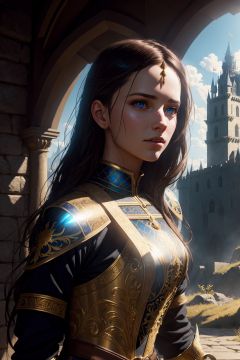 (masterpiece), (extremely intricate:1.3), (realistic), portrait of a girl, the most beautiful artwork in the world, (medieval armor), metal reflections, upper body, outdoors, intense sunlight, far away castle, professional oil painting of a stunning woman by Ed Blinkey and Atey Ghailan and Jeremy Mann and Greg Rutkowski, detailed, sharp focus, dramatic, award winning, matte drawing, cinematic lighting, octane render, unreal engine, volumetrics dtx