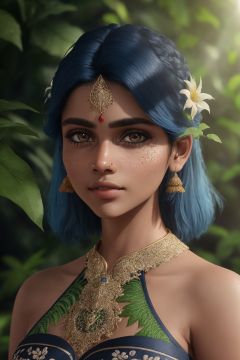 fashion photography portrait of indian girl with blue hair, in lush jungle with flowers, 3d render, cgi, symetrical, octane render, 35mm, bokeh, 9:16, (intricate details:1.12), hdr, (intricate details, hyperdetailed:1.15), (natural skin texture, hyperrealism, soft light, sharp:1.2), detailed, sunlight passing through foliage