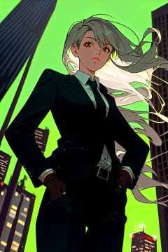(masterpiece, best quality),(((from below, depth of field, dutch angle, green lighting))), floating hair, 1girl, solo, formal, hand in pocket, suit, black gloves, building, looking at viewer, black necktie, fingerless gloves, white shirt, city, outdoors, black jacket, belt, black pants, collared shirt, brown eyes, standing, long sleeves, grey hair, cityscape, open jacket, cowboy shot, skyscraper, black suit, night, pant suit, very long hair