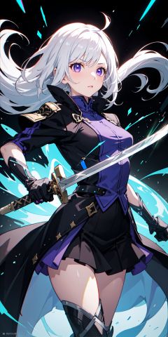 colorful, 1girl, white hair, purple eyes, dual wielding, sword, holding sword, blue flames, glow, glowing weapon, light particles, wallpaper, chromatic aberration,