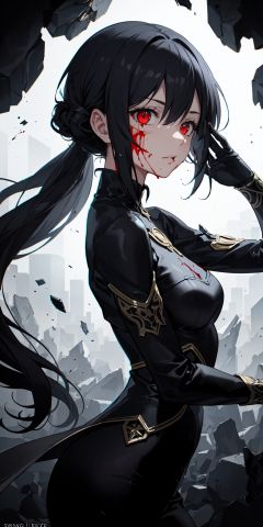(masterpiece:1.2, best quality), (finely detailed beautiful eyes: 1.2), (detailed background,dark fantasy), (beautiful detailed face), high contrast, (best illumination, an extremely delicate and beautiful), ((cinematic light)), colorful, hyper detail, dramatic light, intricate details, (1girl, solo,black hair, sharp face,low twintails,red eyes, hair between eyes,dynamic angle), (blood splatter:1.4), swirling black light around the character, depth of field,black light particles,(broken glass),magic circle,