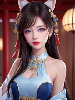 best quality, masterpiece, highres, 1girl,china dress,hair ornament,neckl1girl, animal ears, solo,blue eyes, whisker markings, facial mark, black hair, mole, long hair, red lips, hair ornament, looking at viewer, red nails, fingernails, japanese clothes, bangs, bare shoulders, fox ears, lipsace, jewelry,Beautiful face,upon_body, tyndall effect,photorealistic, dark studio, rim lighting, two tone lighting,(high detailed skin:1.2), 8k uhd, dslr, soft lighting, high quality, volumetric lighting, candid, Photograph, high resolution, 4k, 8k, Bokeh