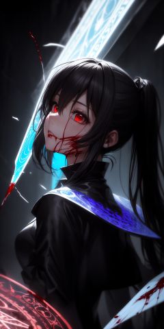 (masterpiece:1.2, best quality), (finely detailed beautiful eyes: 1.2), (detailed background,dark fantasy), (beautiful detailed face), high contrast, (best illumination, an extremely delicate and beautiful), ((cinematic light)), colorful, hyper detail, dramatic light, intricate details, (1girl, solo,black hair, sharp face,low twintails,red eyes, hair between eyes,dynamic angle), (blood splatter:1.4), swirling black light around the character, depth of field,black light particles,(broken glass),magic circle,