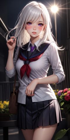 realistic, 1girl, white hair, purple eyes, glowing eyes, school uniform, parted lips, blush, night, flowers, sun, sunlight,