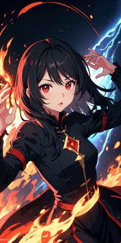 1girl, black hair, red eyes, fire witch, blood, light particles, light rays, wallpaper, colorful,
