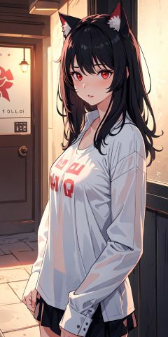 1girl, black hair, red eyes, slit eyes, glowing eyes, oversized shirt, parted lips, blush, cat ears,