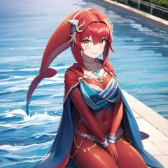 vc9s, 1girl, solo, (red skin:1.2), (a little dolphin on her head), (no bangs), two hands, wear clothing, monster girl, colored skin, hair ornament, jewelry, yellow eyes, no eyebrows, fins, looking at viewer, necklace, smile