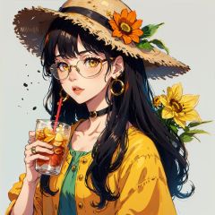 1girl, solo, starfish, seashell, shell, flower, hat, hair ornament, jewelry, straw hat, looking at viewer, sunglasses, hat flower, drinking straw, hairclip, earrings, red flower, tinted eyewear, yellow flower, bangs, english text, multicolored hair, orange flower, black hair, ring, cup, long hair, orange-tinted eyewear, food, brown hair, portrait, shell hair ornament ,