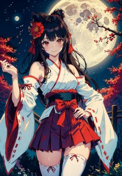 1girl, long hair, solo, thighhighs, black hair, hair ornament, moon, japanese clothes, skirt, detached sleeves, white thighhighs, miko, hakama short skirt, hair flower, very long hair, ribbon trim, ribbon-trimmed legwear, full moon, hakama skirt, hakama, brown eyes, outdoors, night, standing, looking at viewer, flower, hand on hip, tree, red skirt, sky, wide sleeves, smile, ribbon-trimmed sleeves, star (sky), fence, blush, bangs, zettai ryouiki, bare shoulders, night sky, red eyes, nontraditional miko, red hakama, thighs, closed mouth