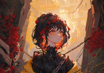masterpiece, best quality, ultra-detailed, illustration, close-up, straight on, 1girl, black hair, yellow eyes, red roses, chains