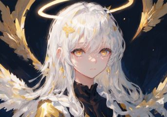 masterpiece, best quality, ultra-detailed, illustration, close-up, straight on, face focus, 1girl, white hair, golden eyes, long hair, halo, angel wings, serene expression, looking at viewer