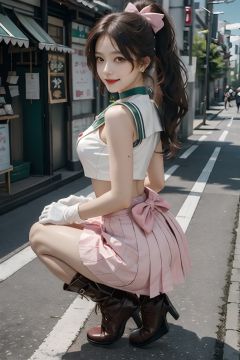 masterpiece, best quality,photorealistic,cosplay,slim body,slender thighs,1girl,day,backlight,softlight,milky skin,gloves,skirt, jewelry, sailor jupiter, green sailor collar, green skirt, earrings, brown hair, hair ornament, green footwear, sailor senshi uniform, choker, green choker, kino makoto, (looking at viewer:1.2), fingerless gloves, ponytail, blurry background, solo, boots, high heels, realistic,(pink bow:1.2), scrunchie, outdoors, bow, sailor collar, pleated skirt, white gloves, long hair, smile, hair scrunchie, lips, blurry, brown eyes, breasts, magical girl, high ponytail, socks, full body, high heel boots,sailorJupiter,aperture1.4,(cityscape,street,tokyo:1.3)