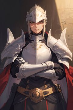 Original Character, Fantasy Concept Art, Volumetric Lighting, Best Shadows, Shallow Depth of Field, Portrait Of Noble Knight Man, Dignified, Delicate Tactical Heavy Armor, Opaque Visor, Face Armor, Pauldrons, Tasset Belt, Gauntlet, Poleyn, High Quality Armor Texture, Broad Shoulders, Extremely Tall. Sword Scabbard, Standing Tall, Crossed Arms, Looking At Viewer, Glaring Sunlight, Rose Garden, Rose Thornbush, (Highest Quality, Amazing Details:1.25), (Solo:1.3), Brilliant Colorful Paintings
