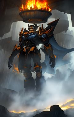 (((masterpiece))), (((best quality))), ((ultra-detailed)), (illustration), ((an extremely delicate and beautiful)),dynamic angle,floating,(painting),(black Armor),mecha,(((evil paws))),rainydays,burning palace,(horrible),((solo)),(Chain),((howling)),bloody,full body,((1man)),fire ring,fog,((look up)),Cloak,(two arms)