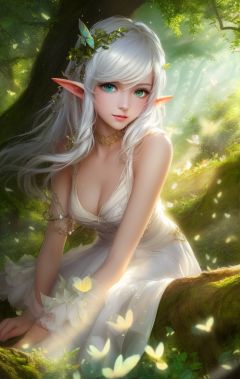 (((masterpiece))), (((best quality))), ((ultra-detailed)), (illustration), ((an extremely delicate and beautiful)),dynamic angle,floating, (beautiful detailed eyes), (detailed light) 1girl, pointy ear, long hair, water, solo, elf, sitting,half body, white hair, chain, green eyes, toeless legwear, barefoot, jewelry, looking at viewer,feather, leaves, nature, (sunlight), river, (forest),(painting),(sketch),(bloom),(portrait:1.2),(butterflys:1.2), (tyndall effect), obscure