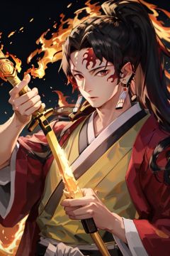 1man, Yoriichi_tsugikuni, solo, looking_at_viewer, upper_body, male_focus, earrings, kimono, glowing, holding-katana, sheath, unsheathing, fire