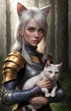 girl holding cat, cat ears, chibi, blue, gold, white, purpple, dragon scaly armor, forest background, fantasy style, (dark shot:1.17), epic realistic, faded, ((neutral colors)), art, (hdr:1.5), (muted colors:1.2), hyperdetailed, (artstation:1.5), cinematic, warm lights, dramatic light, (intricate details:1.1), complex background, (rutkowski:0.8), (teal and orange:0.4), colorfull, (natural skin texture, hyperrealism, soft light, sharp:1.2), (intricate details:1.12), hdr, (intricate details, hyperdetailed:1.15), white hair,