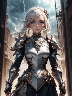 8k,intricate,elegant,highly detailed,majestic,digital photography,cowboy shot,surreal painting,broken glass,(masterpiece, sidelighting, finely detailed beautiful eyes:1.2),hdr,void3nergy lightning storm,woman,wearing regal battle armor,raining,beautiful,facing viewer t,masterpiece,upper body,