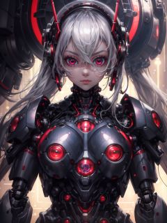 masterpiece,best quality, ((upper body)),one robot girl, (solo:1.2), (growing) red eyes, Mechanical skin, Mechanical joints, close up Meta, background is Cybernetic Laboratory, wake up, kaleidoscope, neon light effect,.