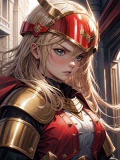 1girl, solo, female romanarmy warrior with helmet on and red cape, long blonde hair, angry
