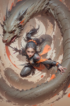 Best quality,masterpiece,ultra high res,1girl,beautiful_face,detailed skin,,gu,dragon,full body,,weapon,black hair,holding weapon,blood,arm guards,male focus,looking at viewer,black eyes,tabi,floating hairfull body,orange,,hands up,