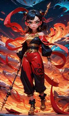 1girl, blood on face, angry, , holding spear, (flying), chinese mythology,cloudy, detailed sky, abstract background, (flame_surge_style:0.5)
