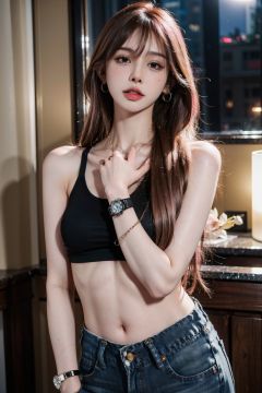 ((masterpiece), (best quality), ultra high res, (raw photo:1.2), (photorealistic:1.4), Exceptional detail, dramatic lighting, highres, 8k, absurdres, solo, CNGirl_2, 1girl, black **** top, black crop top, ((pink hair)), long hair, bar, alcohol,jewelry, jeans, lwatch, denim, wristwatch, earrings, pants, midriff, brown hair, looking at viewer, crop top, indoors, bracelet, sleeveless, plant, bare shoulders, from side, arm tattoo, <lora:CNGirl_2_20-000002:0.7>