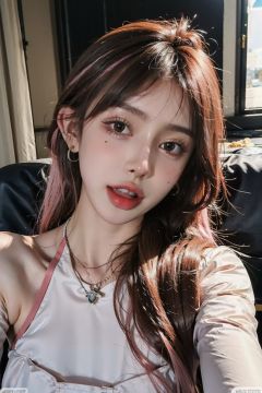 ((masterpiece), (best quality), ultra high res, (raw photo:1.2), (photorealistic:1.4), Exceptional detail, dramatic lighting, highres,   8k, absurdres, solo, CNGirl_2, 1girl, (pink hair), close up,  jewelry, 1girl, v, earrings, necklace, long hair, realistic, toilet,  solo, open mouth, brown eyes,  hair covering breasts, <lora:CNGirl_2_20-000002:0.7>  <lora:Daoist_Robe_v2-000003:0.7>