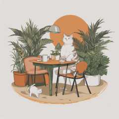 Slight retro color, flat, grainy, riso print style, illustration, cute, white space, low saturation, animal, beach, cat, chair, computer, cup, drink, drinking glass, drinking straw, flower, food, ice, ice cube, leaf, mug, no humans, orange background, palm tree, pencil, plant, potted plant, sand, table, tree, solo, sitting, cup, no humans, shadow, animal, leaf, chair, phone, cat, cellphone, plant, orange background, potted plant, lamp, animal focus, whiskersSteps: 20, Sampler: DPM++ 2M Karras, CFG scale: 7, Seed: 2916361588, Size: 512x512, Model hash: ffde7edfe2, Model: RISO_TUNAN_V2, Denoising strength: 0.55, Clip skip: 2, Hires upscale: 2, Hires upscaler: 4x-UltraSharp