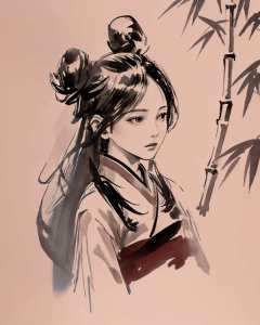 <lora:zyd232_InkStyle_v1_0:1.2> zydink, monochrome, ink sketch, 1girl, upper body, black long hair, hair bun, black eyes, hanfu, bamboo background