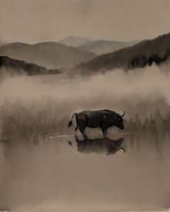 <lora:zyd232_InkStyle_v1_0:1.0> zydink, monochrome, ink sketch, bull, water, reflection, hills, field, clear sky, white background,