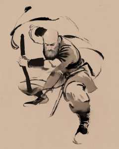 <lora:zyd232_InkStyle_v1_0:1.0> zydink, monochrome, ink sketch, 1boy, old man, bald, long facial hair, long beard, fighting stance, chinese dress, simple background,