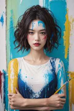 In this lighthearted portrait, a woman is dressed as a fierce warrior, armed with an arsenal of paintbrushes and palette knives. Her war paint is composed of thick, vibrant strokes of color, and her armor is made of paint tubes and paint-splattered canvases. She stands victoriously atop a mountain of conquered blank canvases, with a beautiful, colorful landscape behind her, symbolizing the power of art and creativity. bust Portrait, close-up, Bright and transparent scene lighting