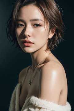 fashion photography portrait of 1girl, offshoulder, fluffy short hair, soft light, rim light, beautiful shadow, low key, (photorealistic, raw photo:1.2), (natural skin texture, realistic eye and face details), hyperrealism, ultra high res, 4K, Best quality, masterpiece, necklace, (cleavage:0.8), in the dark