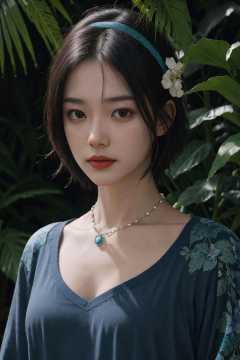 fashion photography portrait of woman avatar, 1girl in blue lush Alien Rainforest with flowers and birds, fantasy, octane render, hdr, Dolby Vision, (intricate details, hyperdetailed:1.2), (natural skin texture, hyperrealism, soft light:1.2), fluffy short hair, , sharp focus, night, necklace, Chinese mythology, cleavage, medium breasts, sci-fi headband, looking at viewer, best quality, perfect body, <lora:FilmVelvia2:0.6>