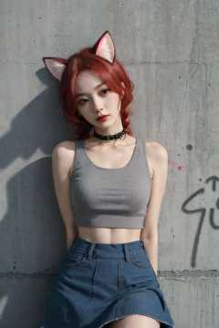 masterpiece, supreme quality, 1girl, solo performance, chic cropped top, vivid red hair, (plush cat ears), sophisticated braid, gentle fringe, captivating choker, (graffiti: 1.5), artistic paint splashes, enticing arms behind back, leaning on wall, gazing at viewer, trendy armband, urban hip-hop flair, flirtatious skirt, mischievous head tilt, powerful expression, warm orange hues, energetic asymmetrical layout, striking geometric patterns, imaginative street art, interplay of sunlight and shadows, <lora:FilmVelvia2:0.6>