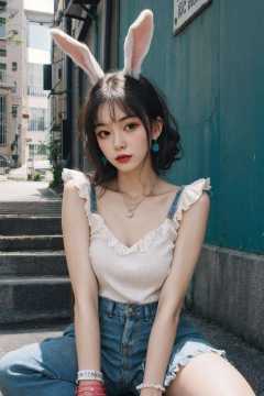 <lora:FilmVelvia2:0.6>, masterpiece, supreme quality, 1girl, extraordinary creation, unparalleled craftsmanship, fashion portrait, (adorable rabbit ears), intricate updo, delicate wisps, mesmerizing pendant, urban, seated on steps, looking at viewer, chic wristbands, contemporary street fashion, ruffled miniskirt, teasing hair flip, captivating gaze, cool teal accents, lively diagonal composition, daring angular forms, innovative mural, dappled light and shade