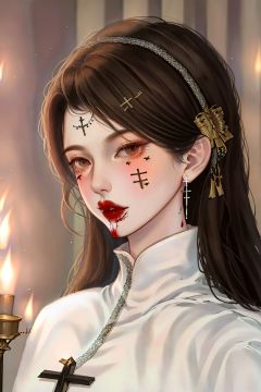 1girl, black hair, blood, blood on face, brown eyes, brown hair, candle, closed mouth, cross, cross earrings, cross necklace, earrings, fashi-girl, hairband, jewelry, latin cross, long hair, looking at viewer, nun, red lips, solo, upper body,mature female