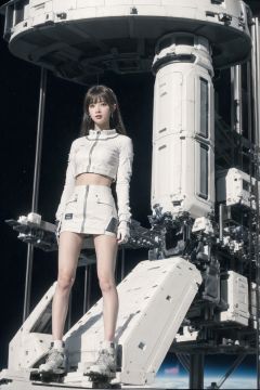 1girl, solo, a colorful mecha girl on the front of space elevator,nsfw,Space elevator, (best quality), (masterpiece),(ultra-detailed:1.2),(photorealistic:1.4),(highres), sky,day, building, cloud, motor vehicle, outdoors, military <lora:space-elevator_v1:0.7>