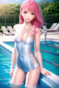 cowboy shot, solo, 1girl, looking at viewer, (8k, RAW photo, best quality, masterpiece:1.2), (realistic, photo-realistic:1.2),1girl, solo,necklace,beautiful, masterpiece, best quality, hiqcgbody, 1girl, pink hair,portrait shot, looking at viewer, partially submerged, outdoor pool, wet skin, intricate details,high resolution, medium breasts, full body , perfect skin, 1girl, in summer, (water), (water splash),at the pool,<lora:nikki:0.8>